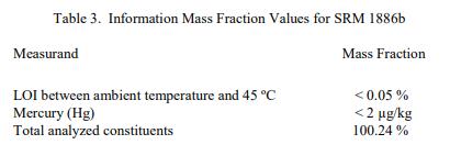 SRM 1886b 成分的認證值在表 1 中報告為收到時的質量分數 [1]。 NIST 認證值是 NIST 對其準確性具有最高置信度的值,因為所有已知或可疑的偏差來源都已被調查或考慮在內 [2]。認證值是對真實值的當前最佳估計。